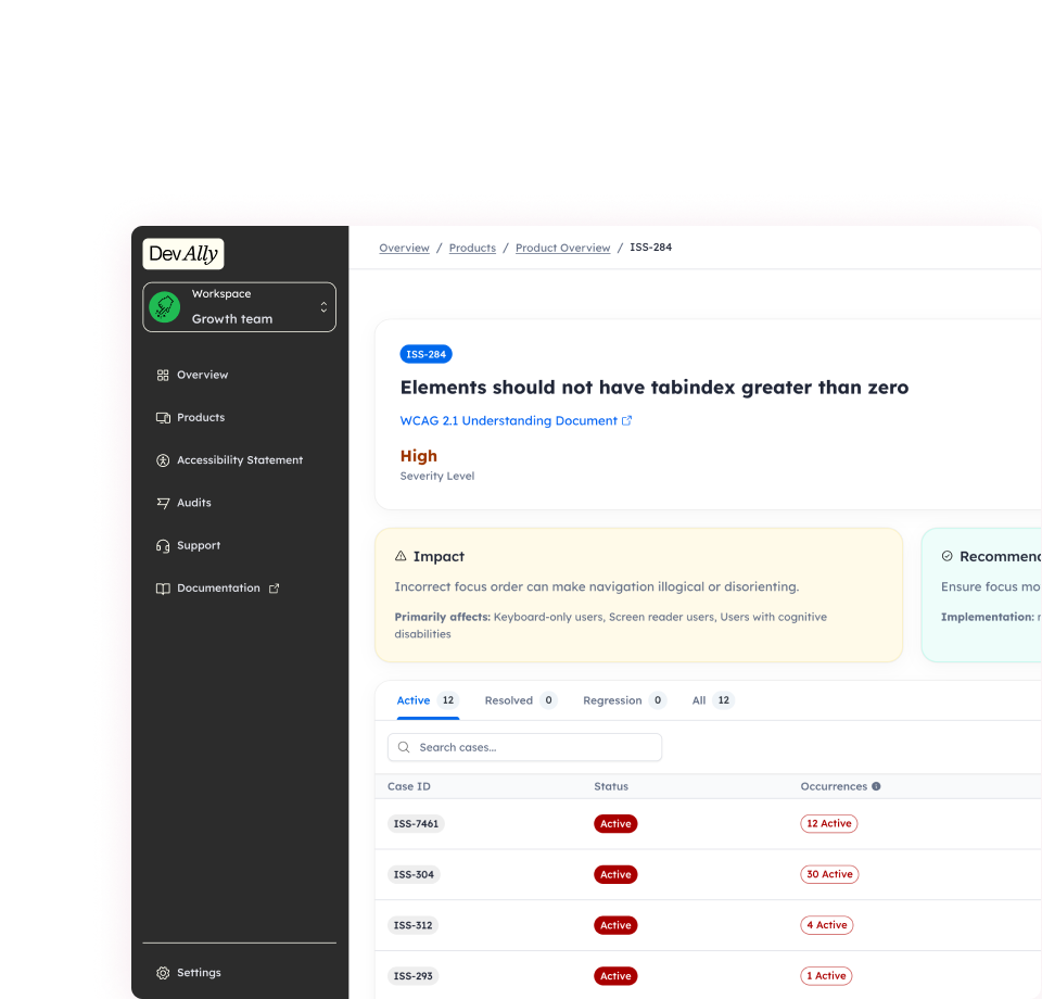 Track and manage accessibility issues with powerful workflows designed for compliance and remediation at scale.
